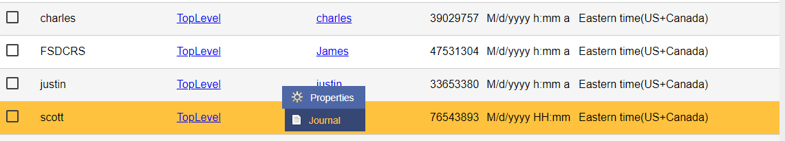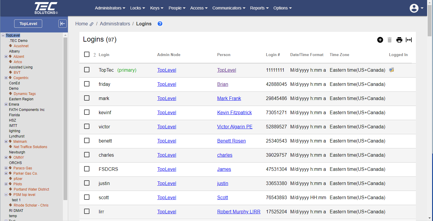 This will bring you to the page to add and edit logins. Please note the left side has what we refer to as “Admin Nodes.” You will want to select the proper node to display the user you wish to edit. See the image below for an example.